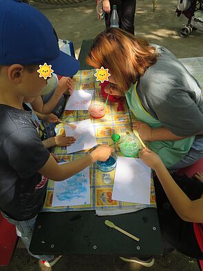 Und unser Haus 2 wird in neuem Glanz erstrahlen - ganz im Sinne des GRÜNschnabels. Die Kinder überprüfen dabei kritisch, ob die Farbe schon getrocknet ist, die am Vortag aufgetragen wurde.