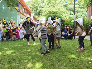 Beim Kartoffelsackhüpfen und Apfellauf hatten die Kinder viel Freude. Eine kleine Pause zum Durchatmen boten die Bastelstation und eine Popcorn-Station im Krippengarten.